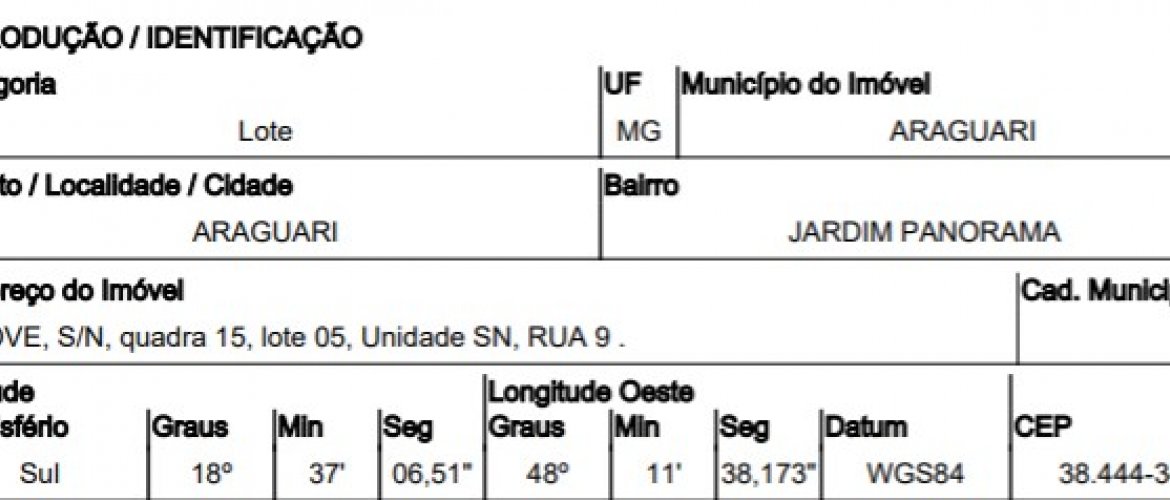 TERRENO DE LEILÃO DA CAIXA, NO BAIRRO LT 05 JARDIM PANORAMA, NA CIDADE ARAGUARI, NO ESTADO MG